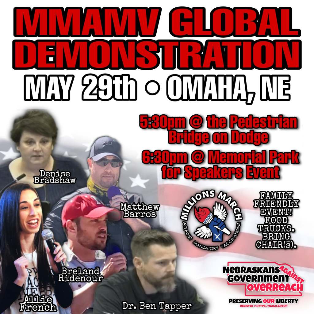 We have several wonderful speakers lined up for this event including Dr. Ben Tapper a member and supporter of Nebraskans Against Government Overreach as well as a prominent voice for the informed consent movement. Breland Ridenour who is in the running for Governor of Nebraska. Allie French, our Founder and Leader of Nebraskans Against Government Overreach and the co-Founder of Millions March Against Mandatory Vaccination. Matthew Barros and Denise Bradshaw will also be speaking along with a few others of our members and local leaders.