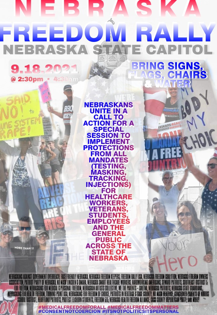Join Nebraska’s largest groups as we stand in unison for protections from all mandates (testing, tracking, masking and injections) on our healthcare workers, veterans, students, employees and the general public across the state of Nebraska.