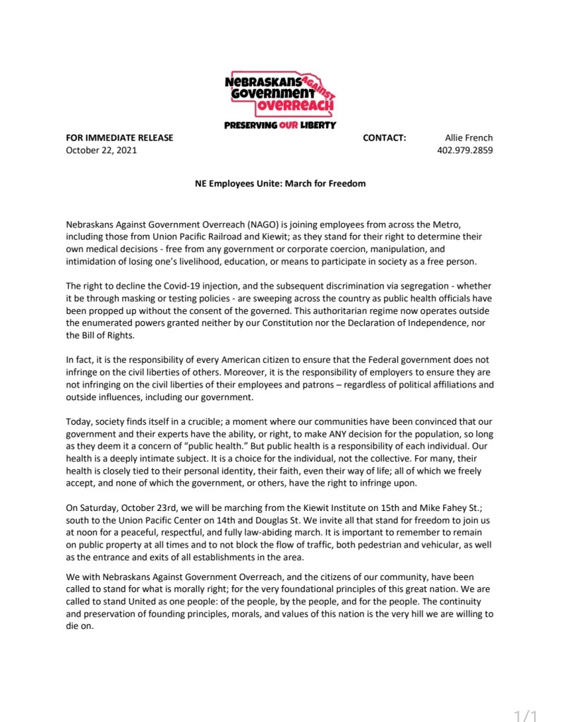 We are releasing notice of a press release for the March for Freedom being held tomorrow in support of employees at Union Pacific, Kiewit and various others across the metro.