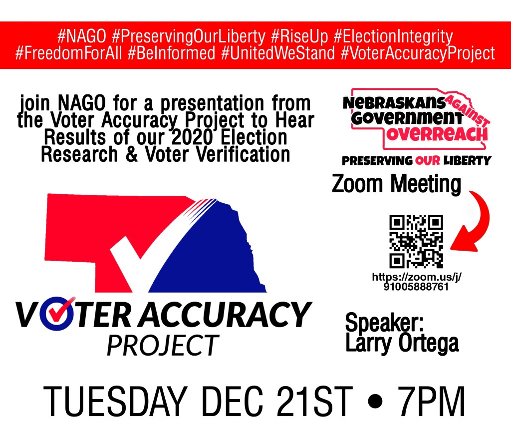 Join Nebraskans Against Government Overreach zoom meeting for the NE Voter Accuracy Project presentation.