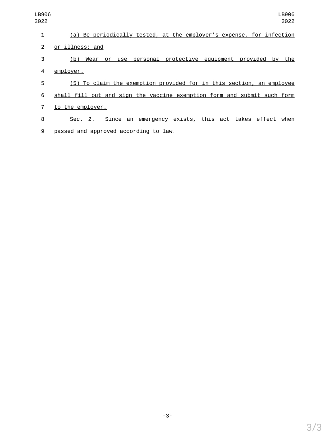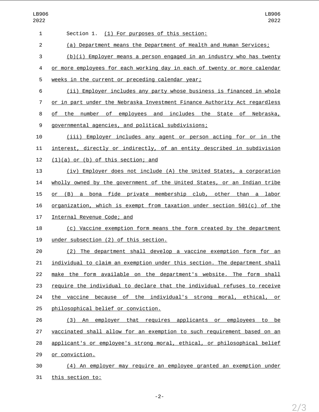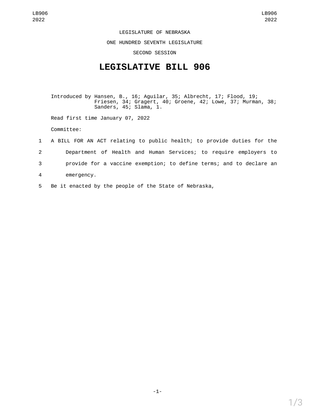 Senator Hansen has recently introduce LB906 – Require employers to provide for vaccine exemptions and provide duties for the Department of Health and Human Services