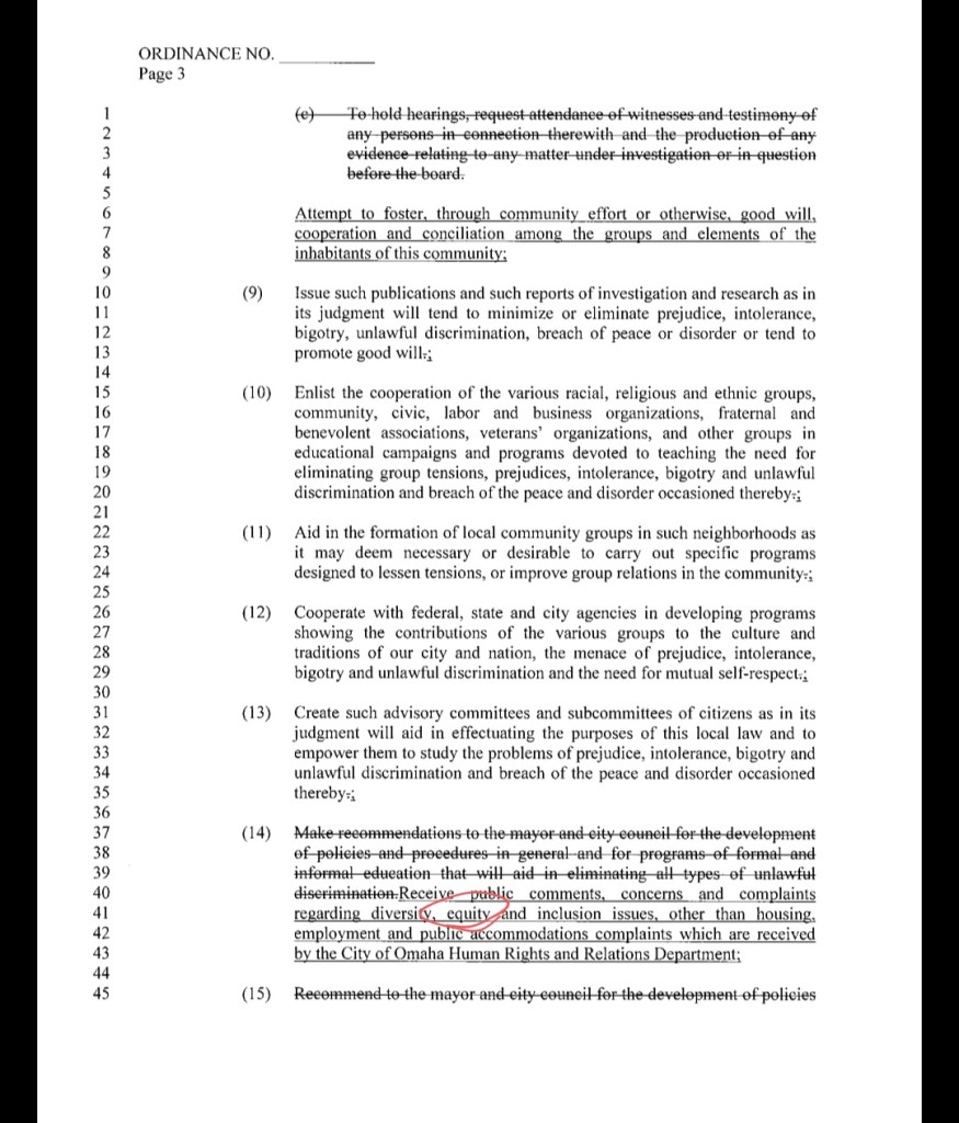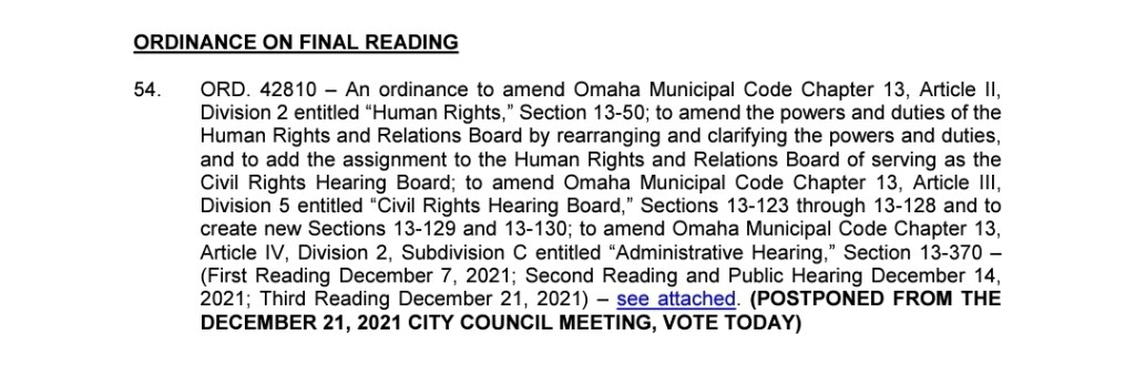 Agenda item 54 is an ordinance that amends the Human Rights and Relations Board. Upon review of the attached changes, it seems to focus on inserting leftist terms related to CRT ideologies.
