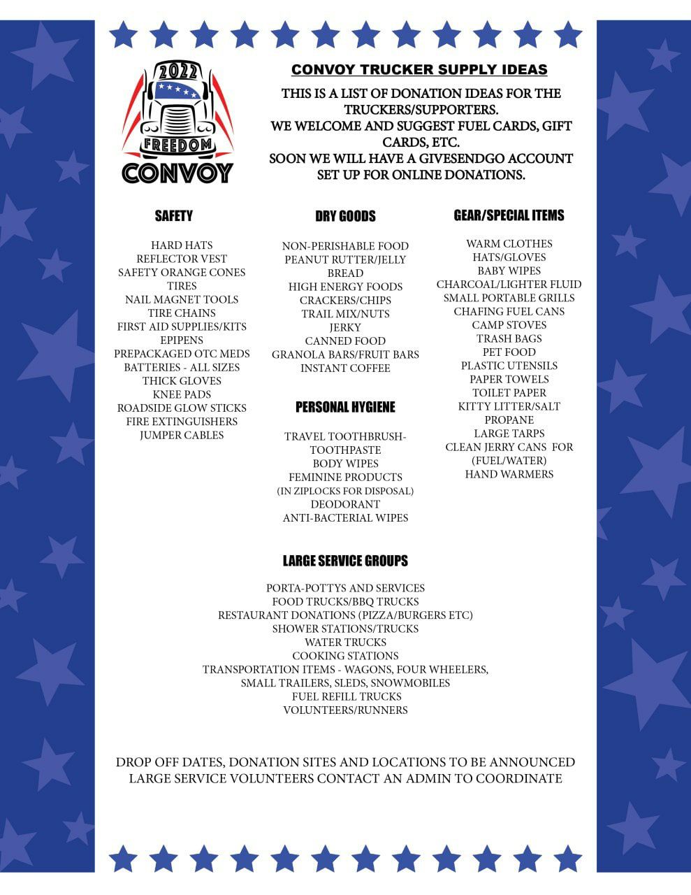 We will have drop off locations determined this week for items to be stored for Convoy support!