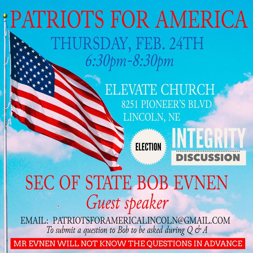 -Thursday, February 24th at 6:30pm Patriots for America – guest speaker, Secretary of State Bob Evnen. I’ll take questions in advance from those who plan to attend. Bob Evnen will not see the questions in advance. Election Integrity is an extremely critical issue and I am sure he will face some very needed and tough questions.