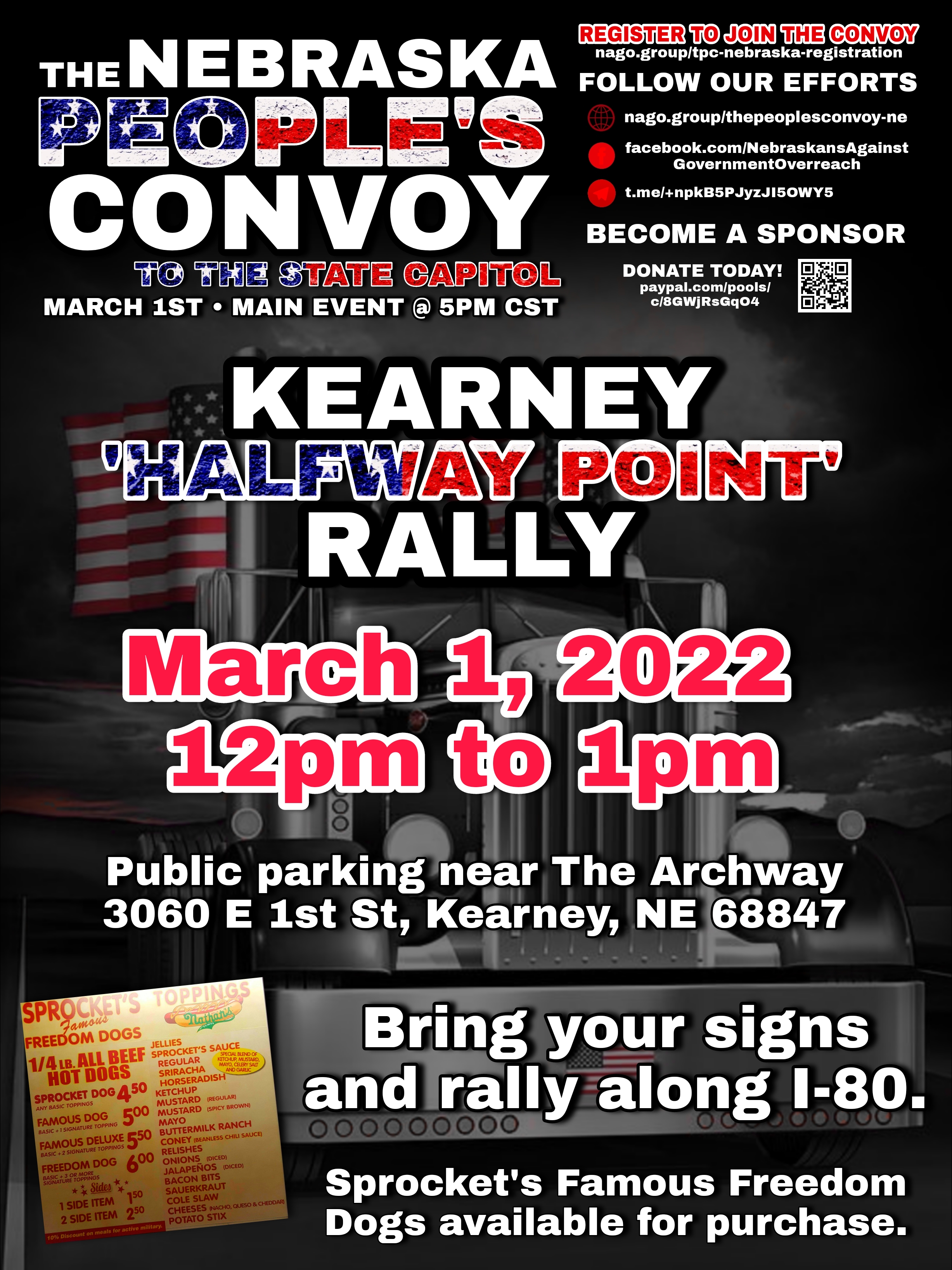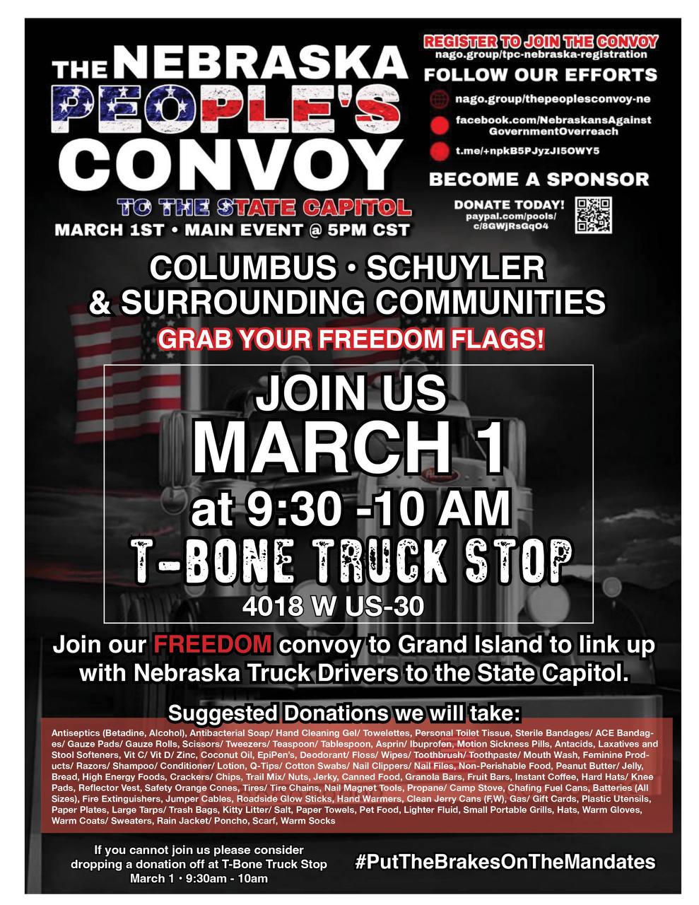 This month’s rally will double as a People’s Convoy donation drop off location for Lincoln, NE during 11a-2p. Bring you flags, your signs, and your energy and let’s get ready to Put America First Again!