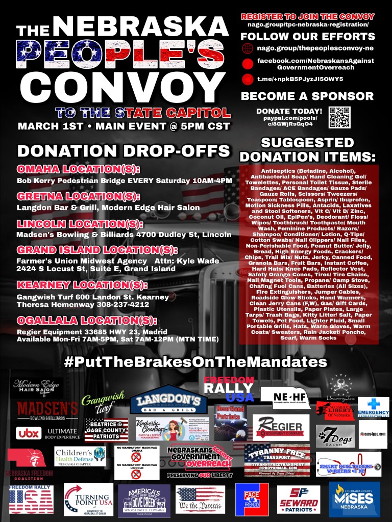 Nebraskans Against Government Overreach, Freedom Rally USA, Nebraskans for Health Freedom and so many others are working together to organize The People’s Convoy – Nebraska.