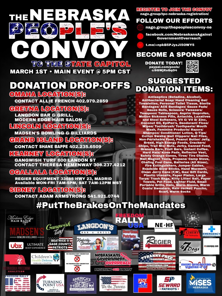 Nebraskans across the state have been busy organizing, collecting donations, making signs, getting out their flags and anticipating the arrival of The People’s Convoy – Nebraska on March 1st!!!