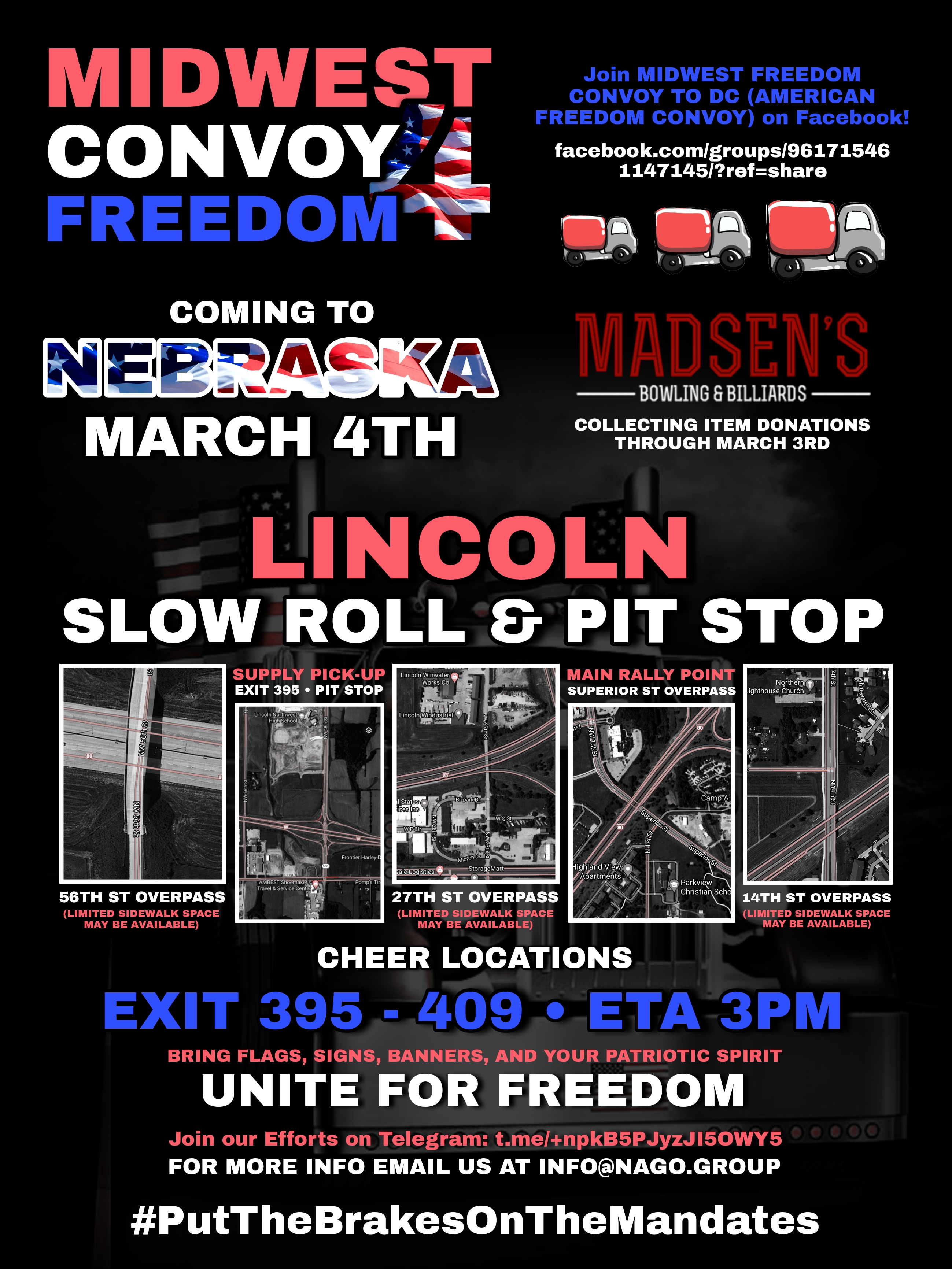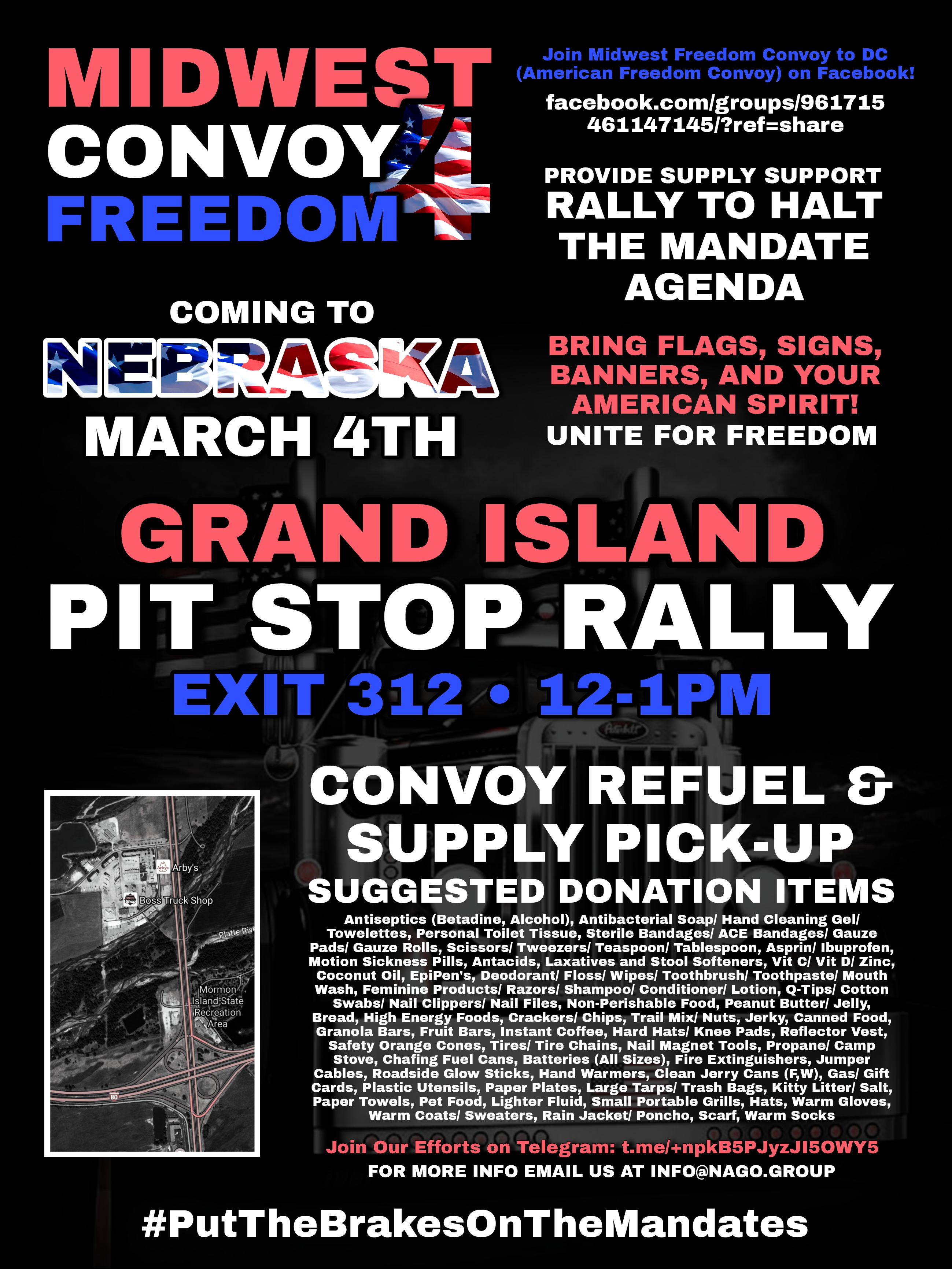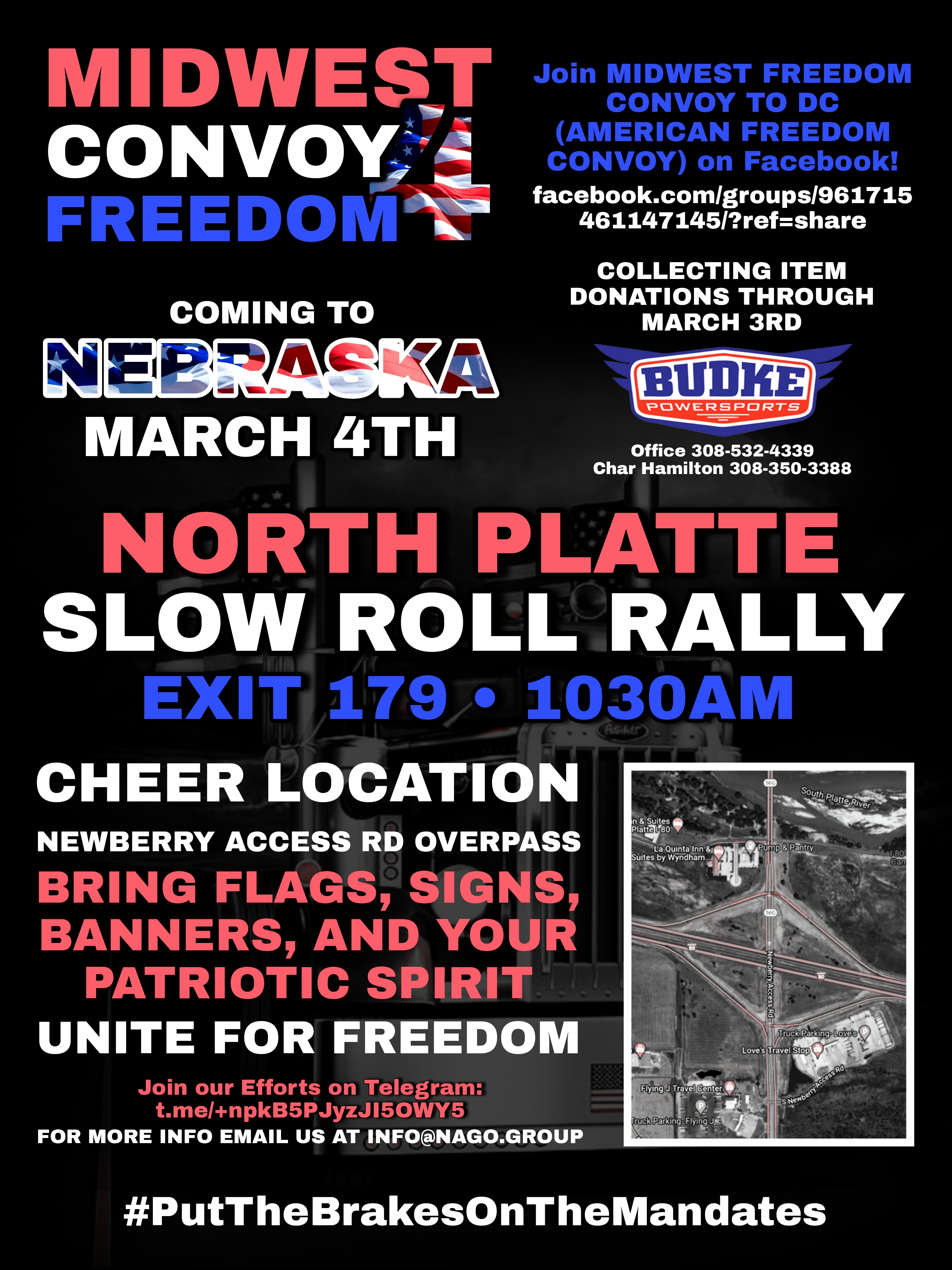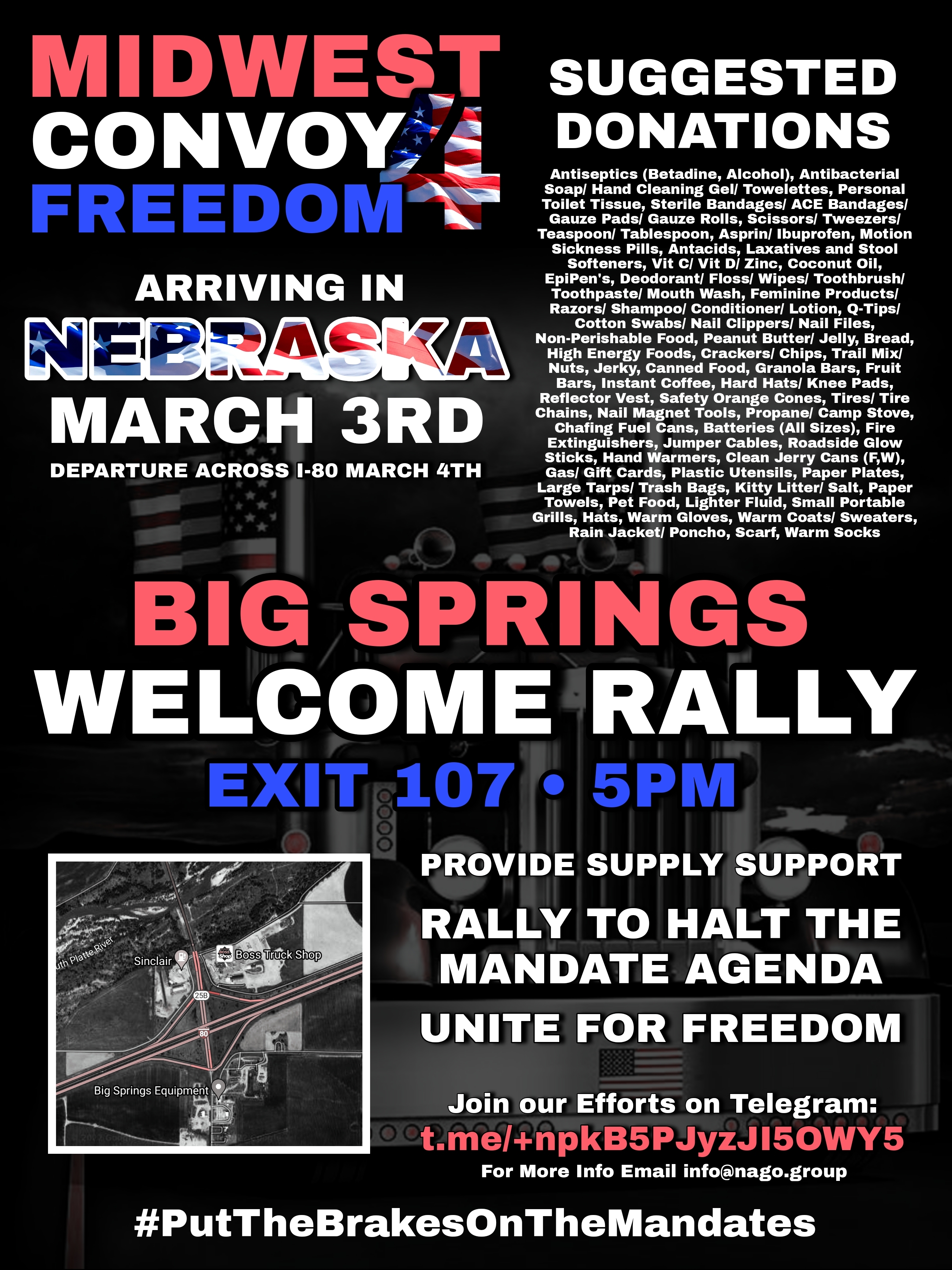 The next event takes place in Big Springs, NE on Thursday about 6pm MST. They have HUGE plans, if you can make it out, please join them!! The Midwest Freedom Convoy will then set off across the state in Friday morning! Please prepare to take a few hours to go line the overpasses and roads along i-80!