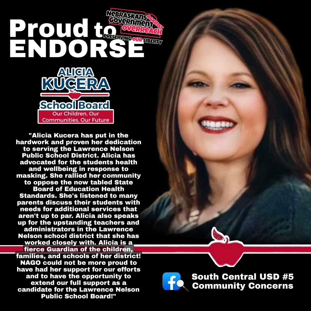 NAGO works hard to ensure that our endorsed candidates hold up to the values and efforts we work so tirelessly on… Alicia Kucera is without a doubt one of those individuals! During our observations and shared efforts over the past year or so, she has remained a dedicated and accessible leader for South Central USD #5 Community Concerns !! Which is why NAGO proudly endorses and recommends a vote for Alicia Kucera on May 10th for the Lawrence-Nelson School Board!!
