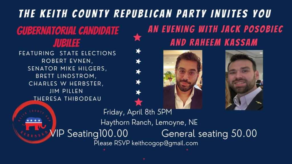 VIP seats are limited and will place you at a table with one of the state or local candidates running in the May10th , 2022 GOP Primary. Social hour and Dinner will be completed with a message from the invited candidates and then a conversation with Jack and Raheem on how we take our country back county by county. Gubernatorial candidates and other local patriots running in our area. Including Chris Bruhn, Elizabeth Tegtmeier, Ed Dunn, Joan Ervin and Kirk Penner. Just Confirmed Congressman ADRIAN SMITH.