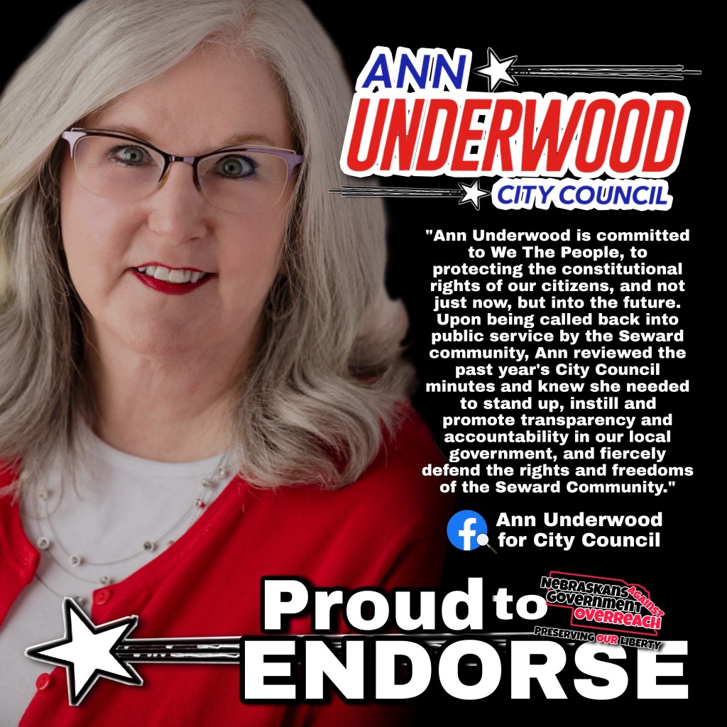 Ann Underwood for City Council in Seward is the exact type of civil servant we look for! A community member that upon hearing the urgent need of the local grassroots group, rose up to the challenge of representing We the People! Ann will be a solid conservative voice and guardian of the liberties in Seward!
