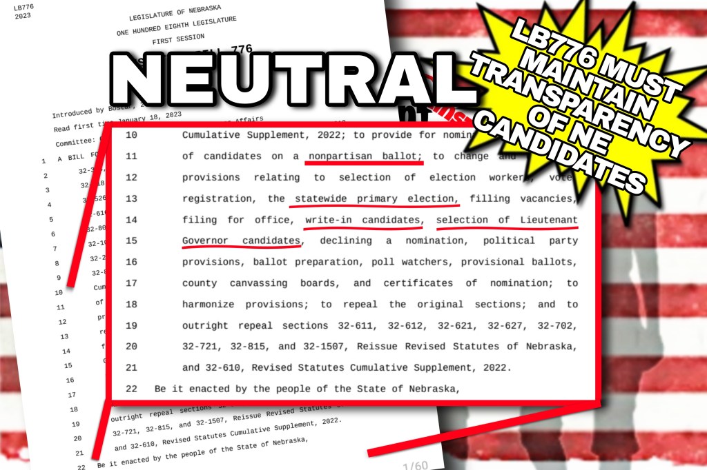 Making elections a Nonpartisan process is in the best interest of all Nebraskans and would eliminate the widely accepted violation of NE Β§32-1507 and Β§32-1508, whereby registered voters falsely affiliate to a party, often temporarily as occured in 2022 statewide partisan elections, to manipulate the outcomes of NE elections.