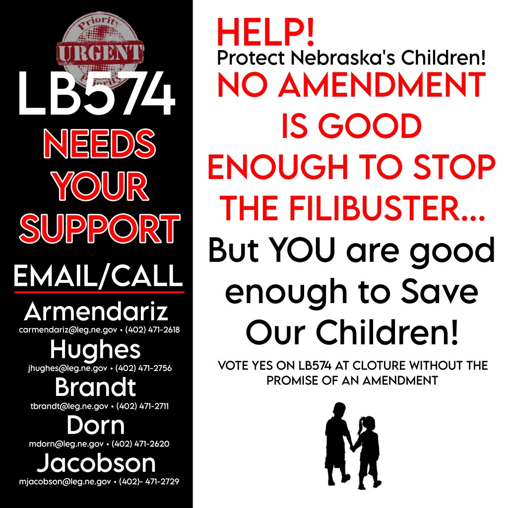 Please reach out to Senators Armendariz, Brandt, Dorn, Hughes, and Jacobsen. In light of the refusal to come to an agreement, encourage these senators to support LB574 through cloture without the promise of an amendment.