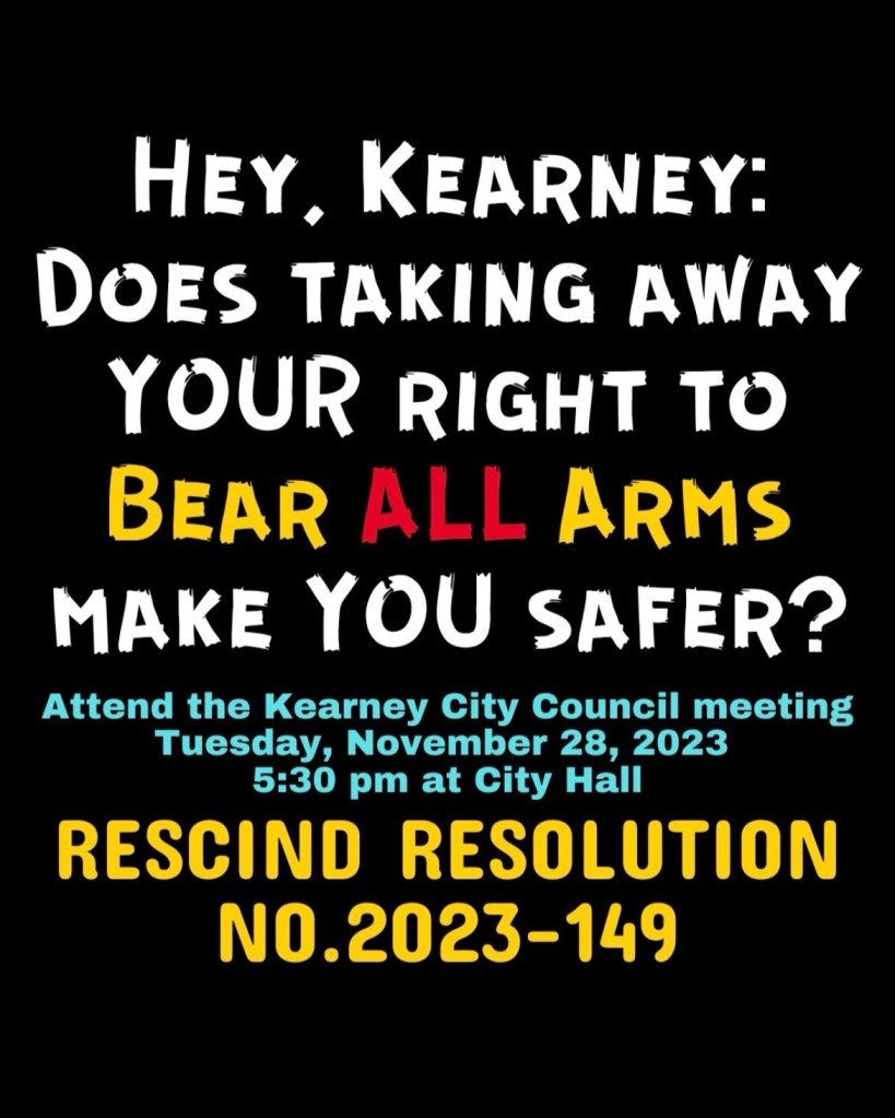 On October 10, 2023, the Kearney City Council approved an incredibly restrictive resolution (No. 2023-149) that infringed on not only the 2nd Amendment but on any weapon that could be used for self-defense. Only 3 council members were present. The resolution was buried with other items and passed unanimously under a consent agenda.