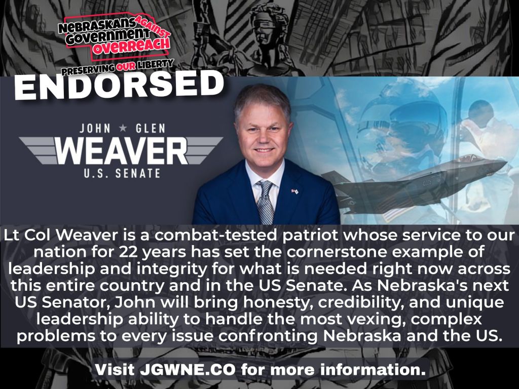 Congratulations, Lt Col Ret. John Glen Weaver for US Senate for US Senate on the endorsement!!! As Nebraska’s next US Senator, John will bring honesty, credibility, and unique leadership ability to handle the most vexing, complex problems to every issue confronting Nebraska and the US.