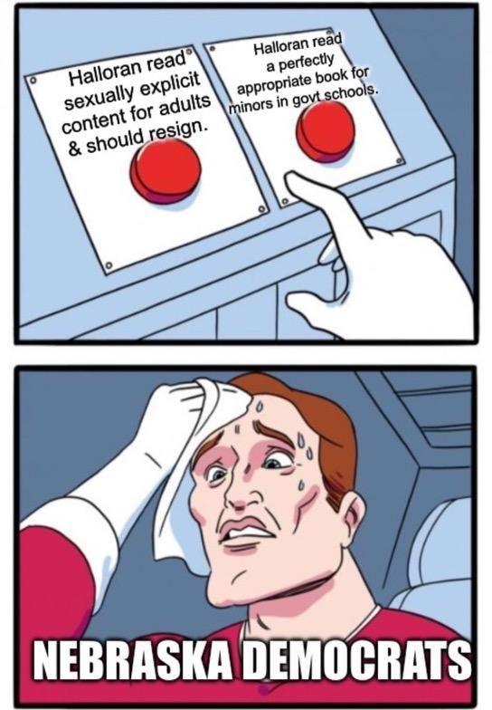 The hypocrisy is rich. The content was too explicit for the legislative floor and public media, but it is totally fine in public schools?! Unfortunately, the media is running with her warped version and has completely lost focus that the democrats at large are excusing explicit and obscene material in our public schools and libraries. This has clouded the judgment of a few of our senators. Email them ASAP and tell them to support the vote to reconsider on LB441 and to vote YES on the bill!