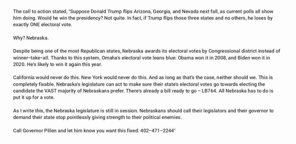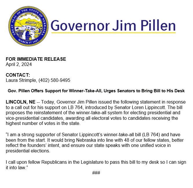 Good evening NAGO members and followers. As many are aware a call to action for LB764, to move us over to “Winner Take All” was released this afternoon.