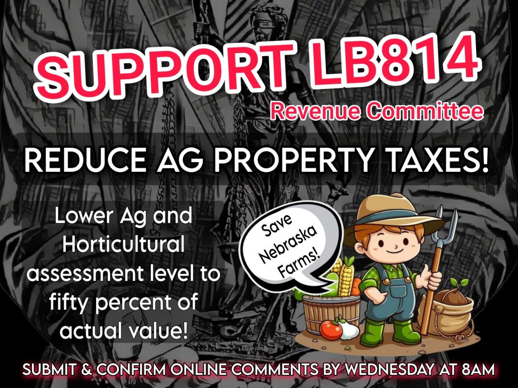 Statement of Intent: *The intent of LB814 is to reduce the taxable valuation of agricultural land and horticultural land in Nebraska. Under current law, agricultural land and horticultural land are assessed at seventy-five percent of their actual value for property tax purposes. LB814 would lower that assessment level to fifty percent of actual value. The bill would take effect beginning on or after January 1, 2027.*