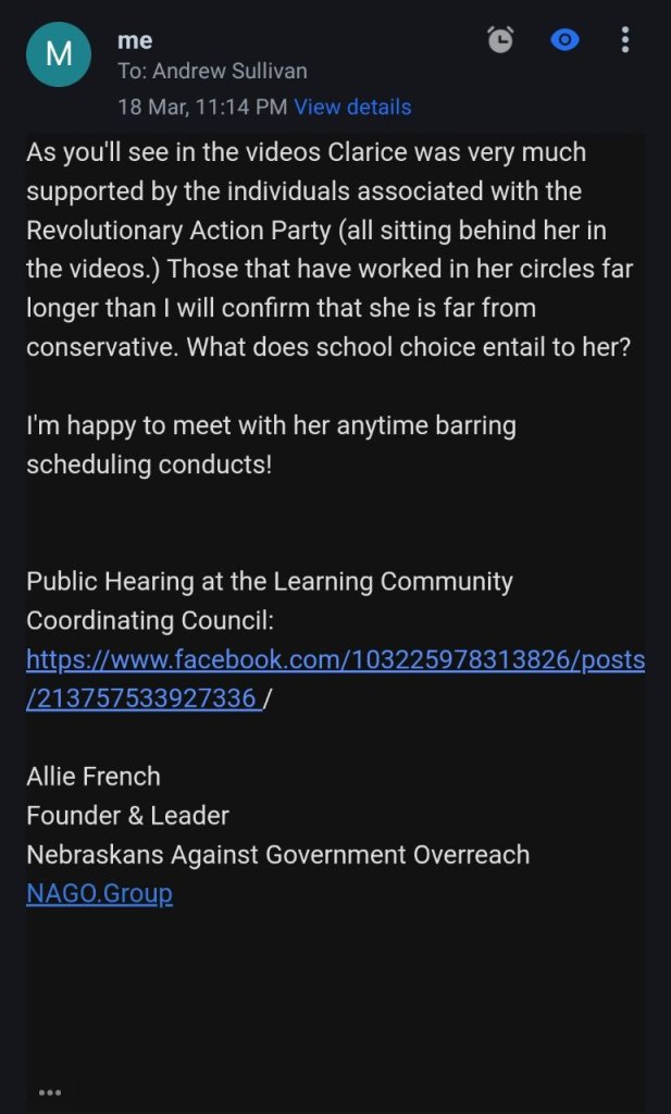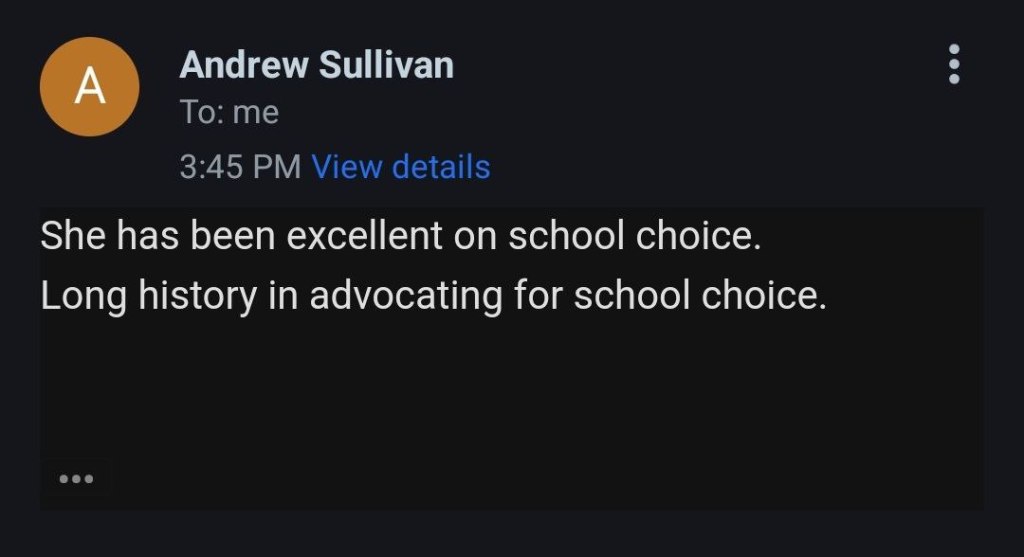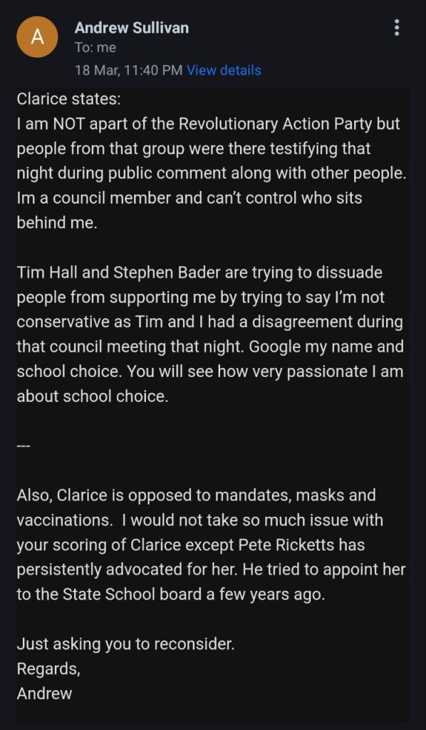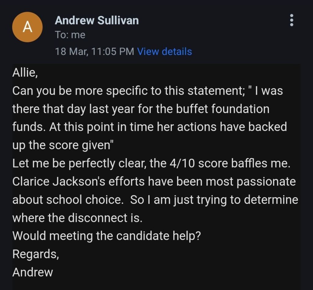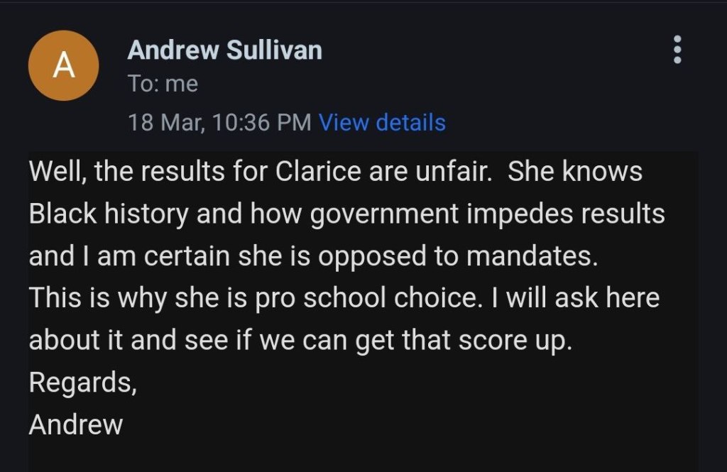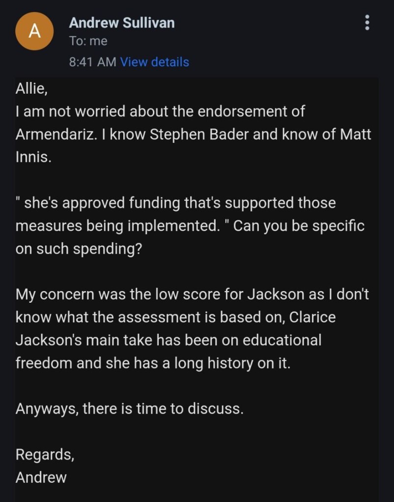Email conversation with a Andrew Sullivan with Clarice’s campaign team. As you can see there is nothing more to her platform than the claim to stand for school choice. Unfortunately, there are plenty of liberals and socialists that support school choice and nothing shared with us would signify that Clarice is in fact a conservative.