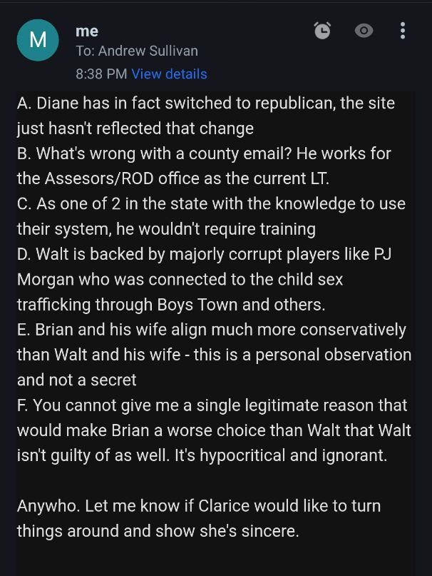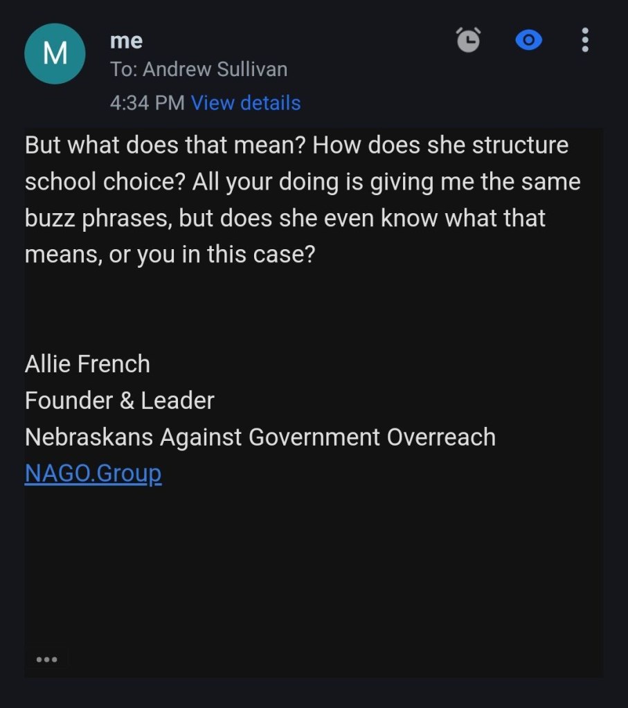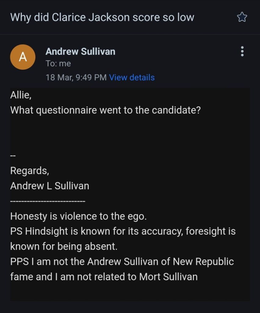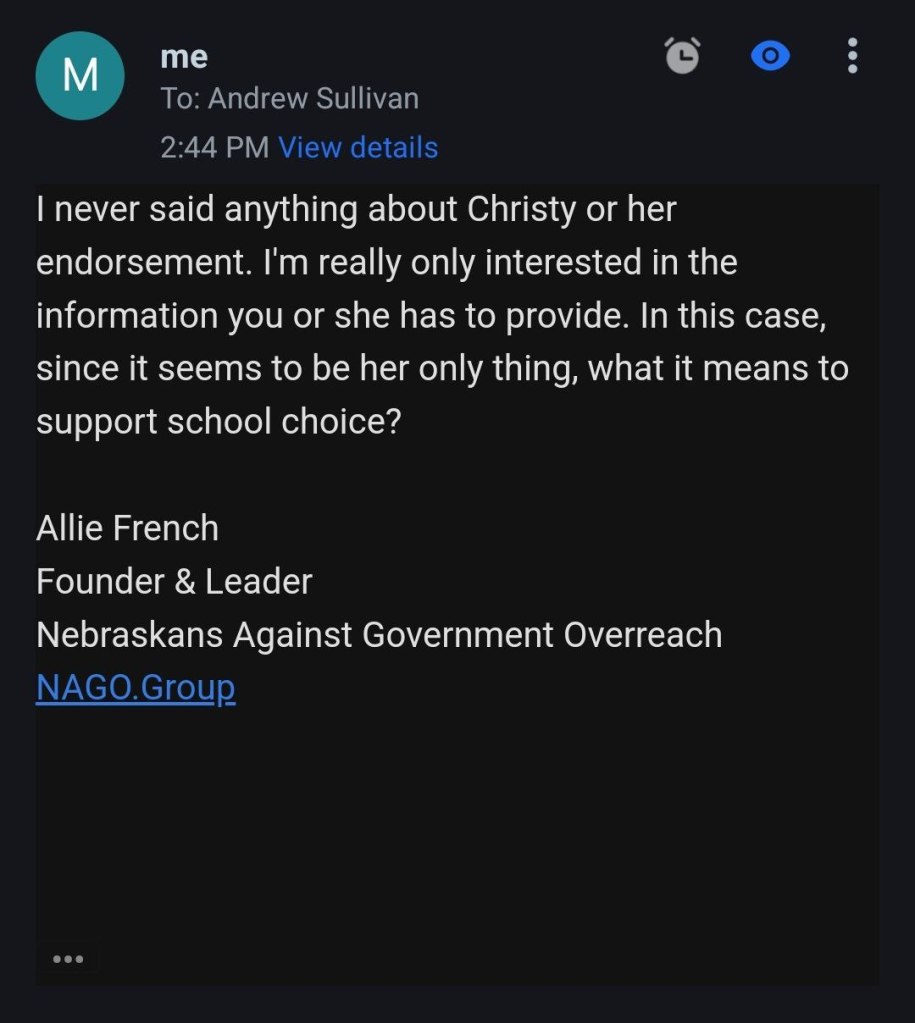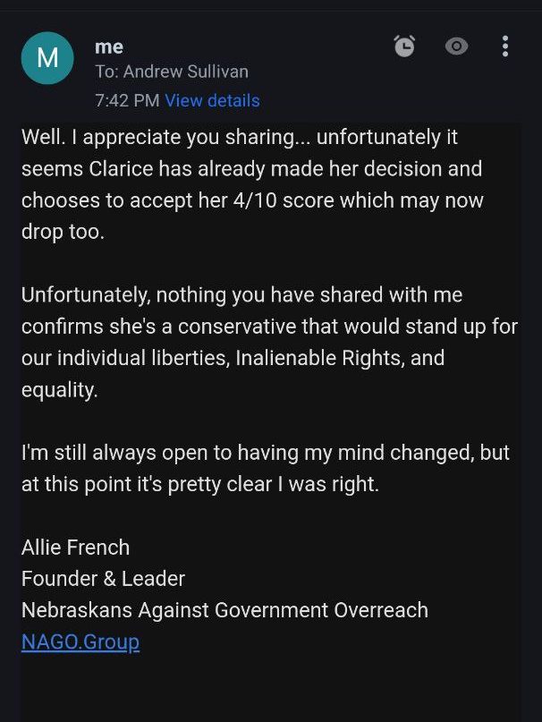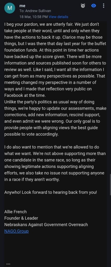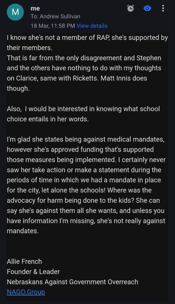 Email conversation with a Andrew Sullivan with Clarice’s campaign team. As you can see there is nothing more to her platform than the claim to stand for school choice. Unfortunately, there are plenty of liberals and socialists that support school choice and nothing shared with us would signify that Clarice is in fact a conservative.