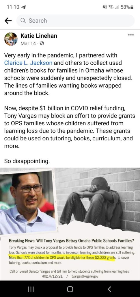 FAIL. Clarice voted in favor of funds to provide anti-racist training to teachers in Douglas and Sarpy County. Even if it was not mandatory training, the fact of the matter is that Clarice supports both liberal agenda and accepts their money. Clarice also continues to cater to the concept of the “pandemic” causing a “learning loss”. A completely made up term to shirk the responsibility the policymakers of our educational institutions hold for causing irreparable harm due to covid-19 restrictions and medical mandates they implemented. Despite sitting on a board that deals with the training of teachers and education of students, she has never spoken publicly about the harm that masks are causing students, their families and teachers.