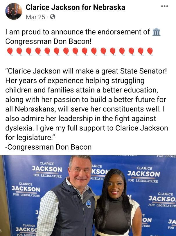 Clarice Jackson has been historically supported by leftist grassroots groups such as Revolutionary Action Party and NOISE. Today she is being endorsed by every RINO in the metro area including Don Bacon, Mayor Stothert, Hal Daub, and more.