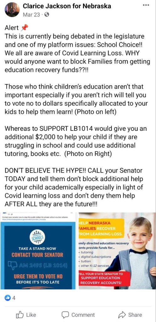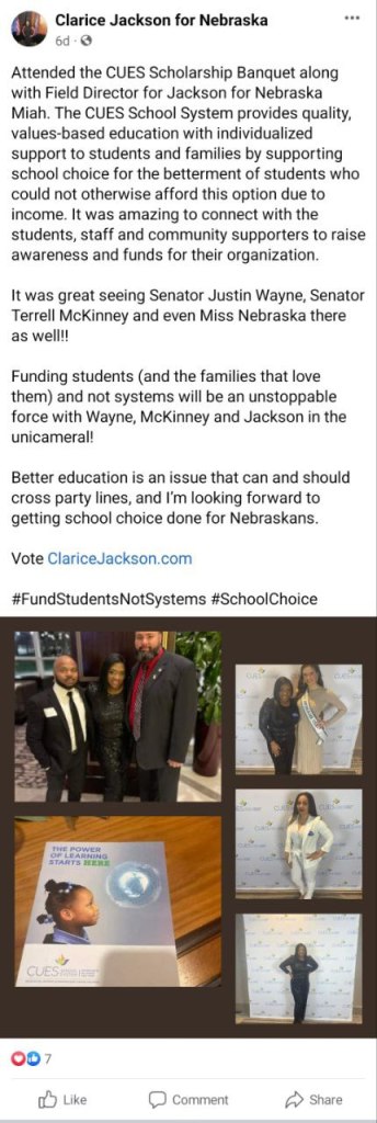 Clarice Jackson has failed Nebraska’s Children in maintaining their innocence and protecting them from receiving radical education as a board member of the Learning Community Coordinating Council for Douglas and Sarpy County. Clarice has violated our trust to uphold true conservative values and to conduct with transparency and honesty to her constituents as a legislator for the state. Clarice Jackson does NOT qualify as a candidate that NAGO looks for.