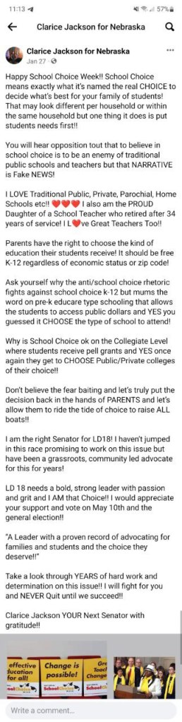 The first image below is Clarice’s “explanation” for her support of school choice. Note her two criteria for supporting school choice is access to public dollars and getting to CHOOSE the school you want, and that it be free… All citizens have the right to a free public education. If they choose private school they can’t expect that to be free, but they also shouldn’t be expected to still pay taxes on a public school they aren’t utilizing.