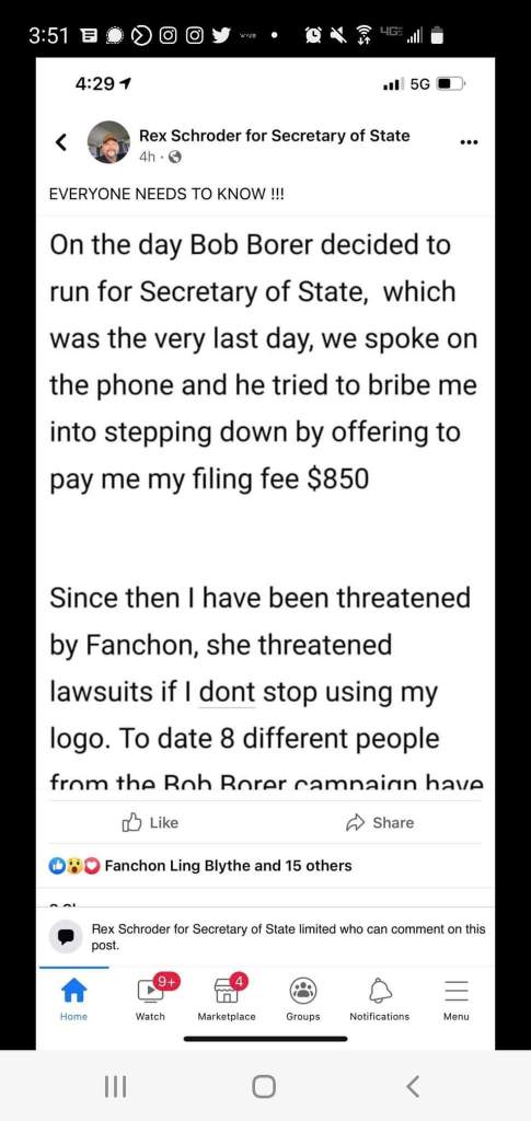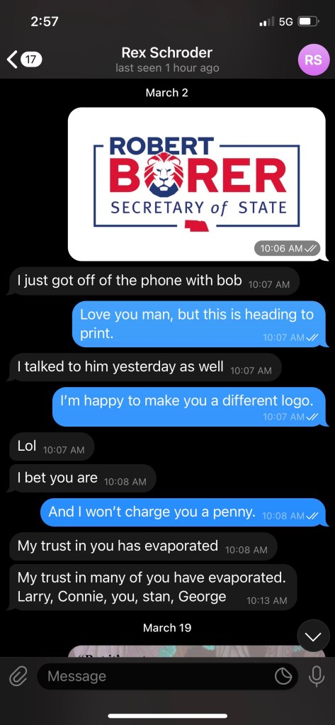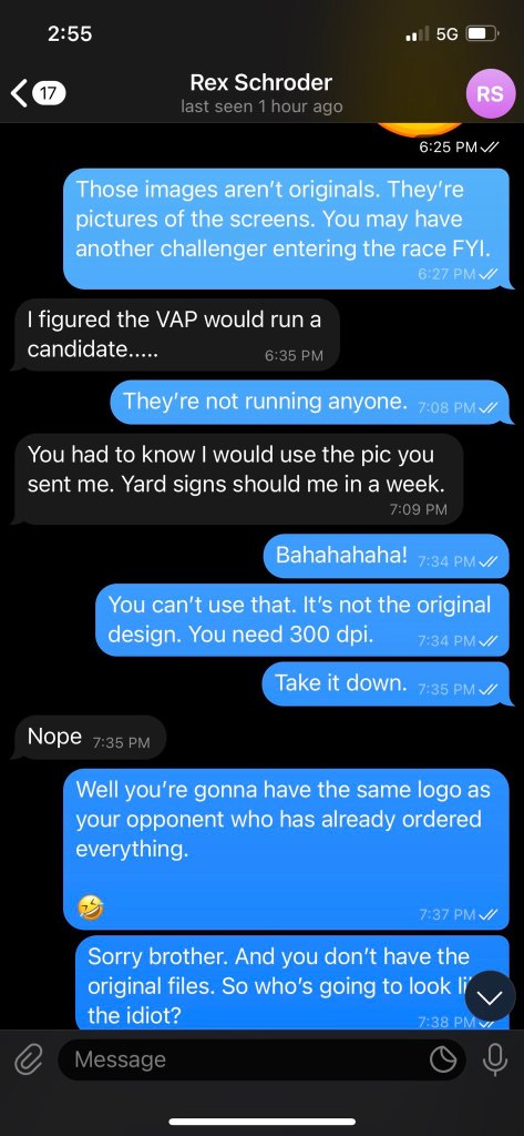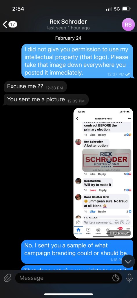 In the images below you will see a conversation between Rex Schroder and Elliot Bottorf. They were discussing the image of a mock logo professional graphic artist Elliot had put together as an example of what he could offer Rex and Rex stole the image of a picture on a computer screen to use for his logo. Despite recent allegations that Fanchon Blythe was threatening Rex over the logo recently, Rex has known that he did not have rights to this logo long before Bob Borer entered the race for SoS. We know this, because Allie French specifically stated this to him at the State Capitol on the election integrity public hearing day. Rex also attempts to accuse Bob Borer of bribing him to drop out of the race – this is a false accusation. Rex was complaining to Bob about having entered the race when he was already in the race (even though he’s made zero traction) and was upset he’d spent $850 on filing fees and what not, at which time Bob did offer to reimburse him because he felt badly. No one at any time affiliated with NAGO or Bob Borer’s campaign have attempted to obstruct the Rex Schroder campaign. It’s not worth the time.