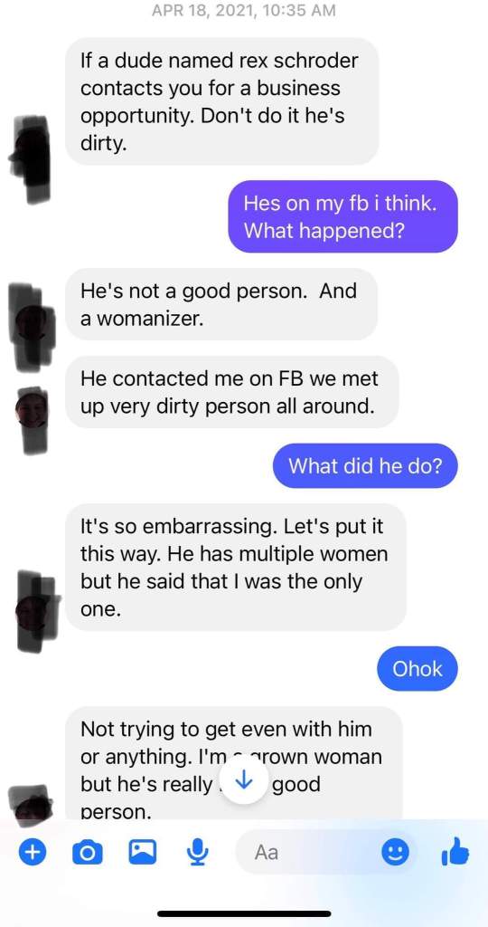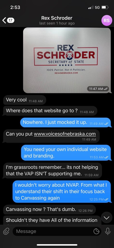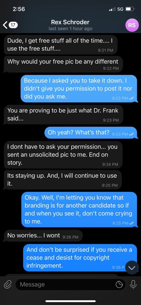 Conversation between Rex Schroder and Elliot Bottorf. As you can see Rex is not a nice person and will blatantly lie and make things up to try to manipulate you. Since this time Dr Frank continues to support these individuals and has endorsed Bob Borer for Secretary of State.