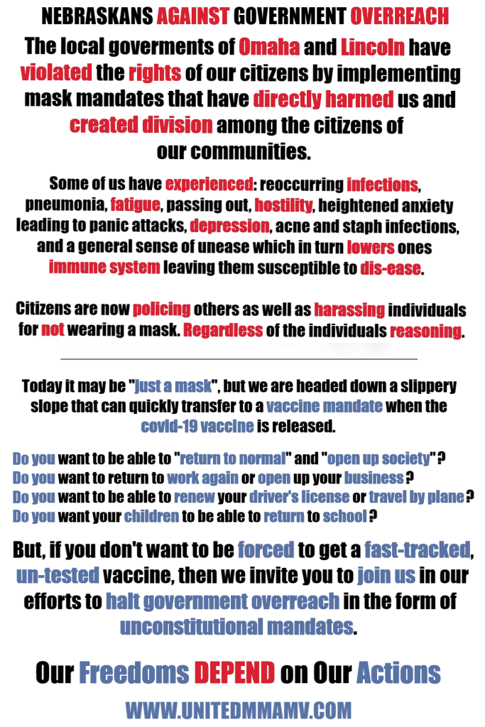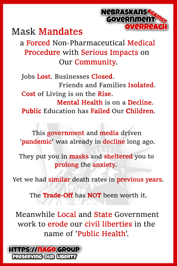 In an effort to raise awareness about the precedent that the Mask Mandates create for our local communities NAGO teams up with MMAMV. You can read about our Omaha MMAMV Freedom Rally last October on the NAGO Timeline page.