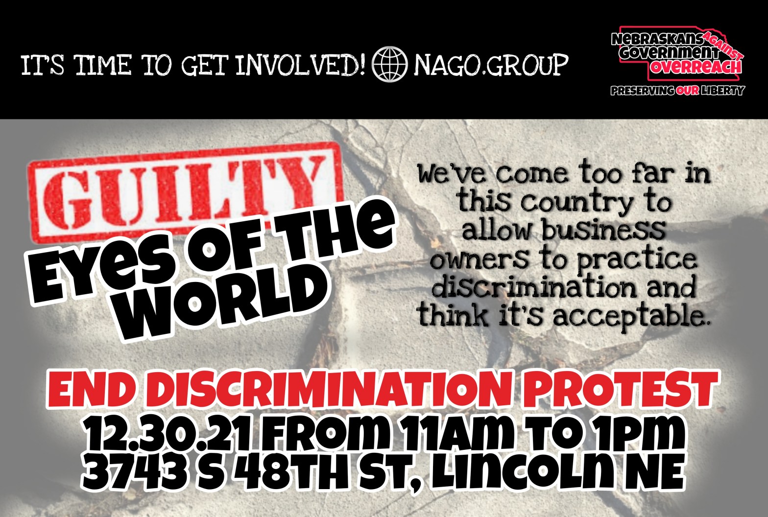 How are businesses allowed to discriminate in 2021?! We would love some help from surrounding communities to show Lincoln businesses that we are done putting up with this! #noMandates #FmedicalDiscrimination #NAGO #PreservingOurLiberty #RiseUp Please join us TOMORROW for a peaceful protest at “Eyes of the World” in Lincoln NE from 11am to 1pm! Eyes ofContinue reading “Peaceful Protest TOMORROW • Lincoln NE”