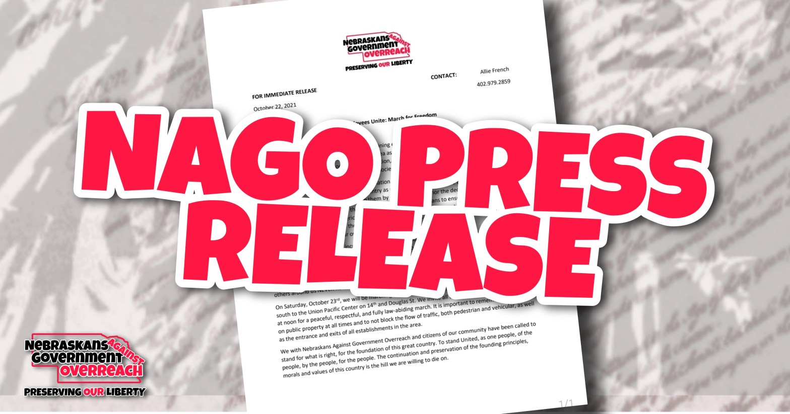 We are releasing notice of a press release for the March for Freedom being held tomorrow in support of employees at Union Pacific, Kiewit and various others across the metro. We encourage our members, friends and the general public to join us in support of medical freedom for ALL. #MEDICALFREEDOMFORALL #MEDICALFREEDOMMATTERS #CONSENTNOTCOERCION #ITSNOTPOLITICSITSPERSONAL #NAGO #PreservingOurLibertyContinue reading “NE Employees Unite: March for Freedom, Oct 23rd”