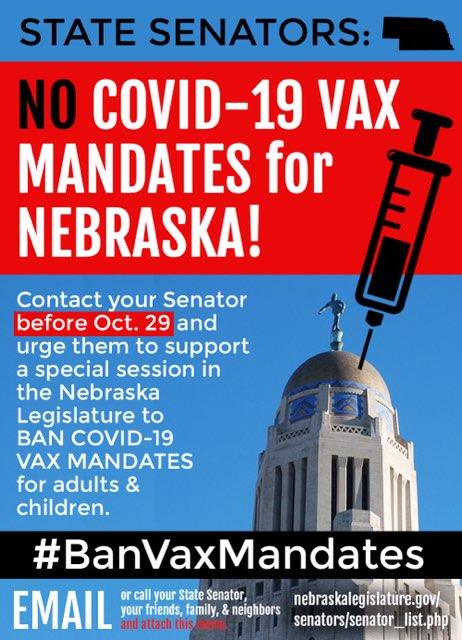 Our hard work is paying off… but! We’re not done yet!!! We at Nebraskans Against Government Overreach appreciate our senators that have taken the steps to implement protections for tens of thousands of Nebraskans who stand to lose their livelihoods due to unconstitutional medical mandates. These deadlines are coming up fast and our communities areContinue reading “NE State Senators Calling for Special Session”