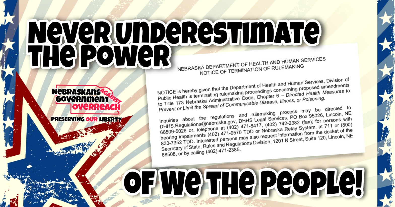 Look at YOU!!! Our hard work, our phone calls and emails PAID OFF!!! Without the members and concerned citizens of Nebraska, we would not have the influence we do as a united team!!! It is not often, that we’re aware of, where plans to rewrite are scrapped so quickly, especially after notice of a publicContinue reading “The Will of the People”