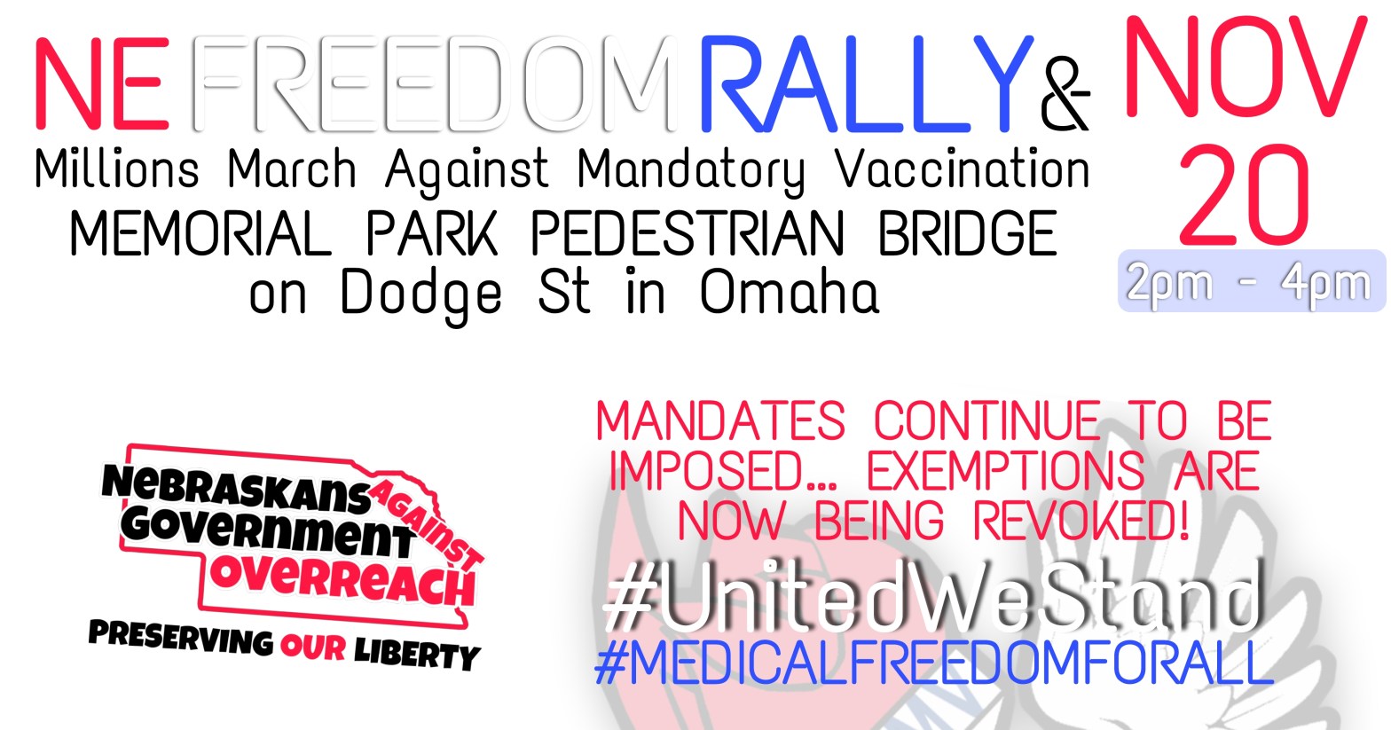 Thank you to all whom made it out today!!! What a wonderful turn out and the weather was amazing. We had several groups unite for a day of raising awareness to halt the agenda mandate. We The Parents – Nebraska, Freedom Rally USA, Children’s Health Defense – NE Chapter, as well as a few gatheringContinue reading “Nationwide Freedom & MMAMV Rally”