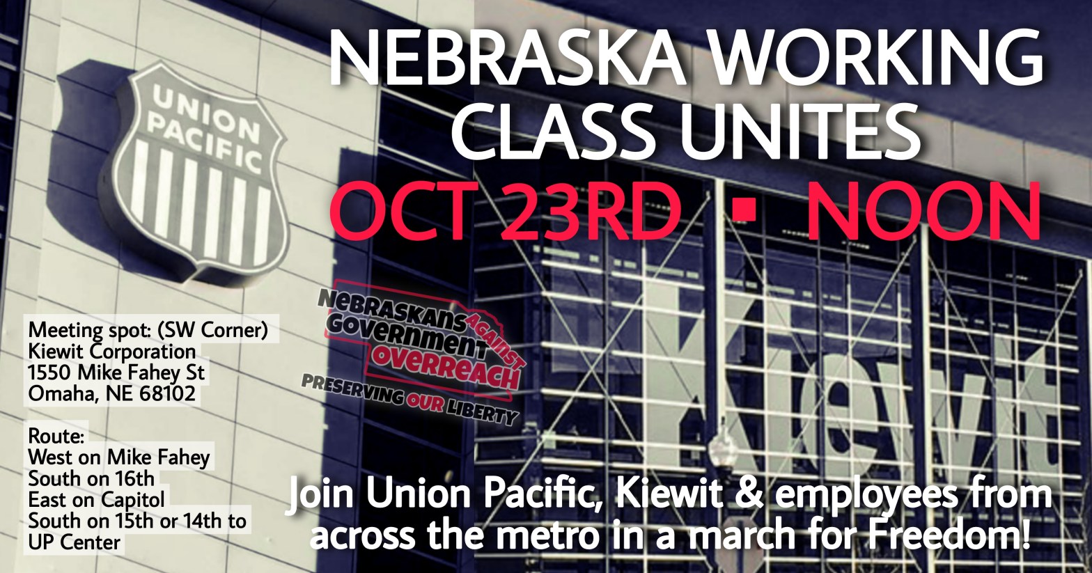 It’s that time again, that we #riseUp and join the Hardworking Americans here in the Omaha metro. Union Pacific Railroad and Kiewit Corporation among many other employers have taken the authoritarian position of implementing mandates on their employees. We at Nebraskans Against Government Overreach are answering the community’s call to action and will stand withContinue reading “NE Working Class Unites ▪︎ Oct 23rd ▪︎ NOON”